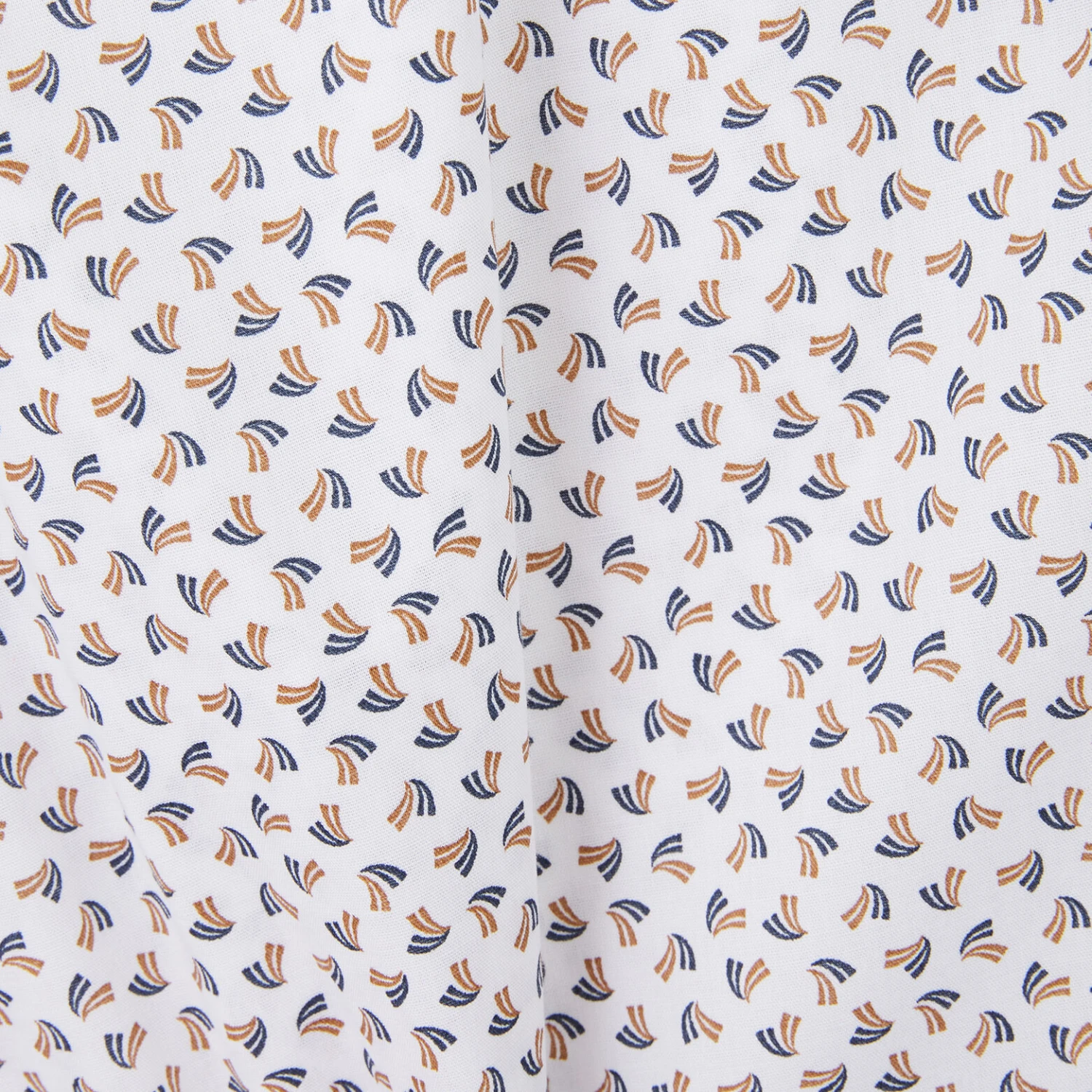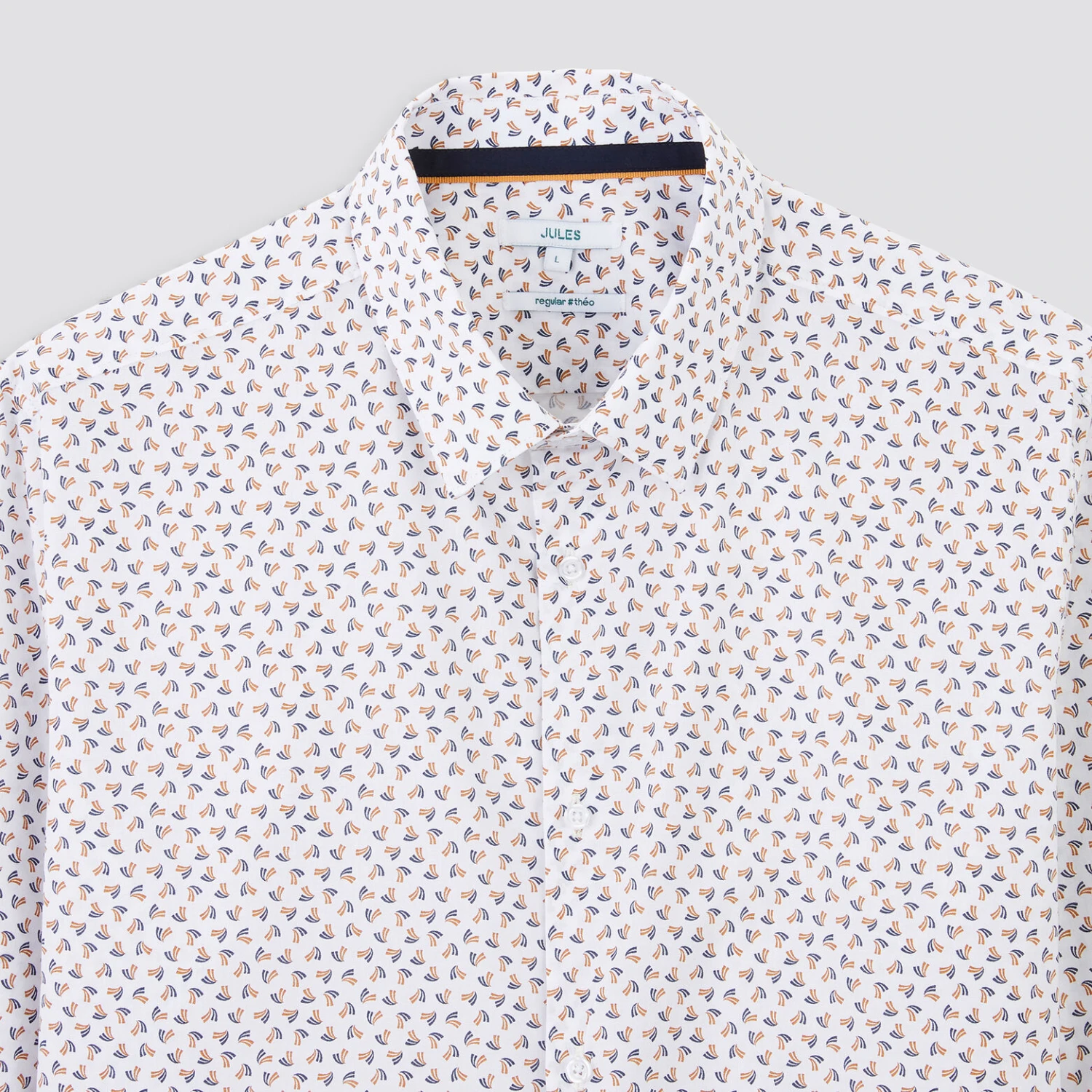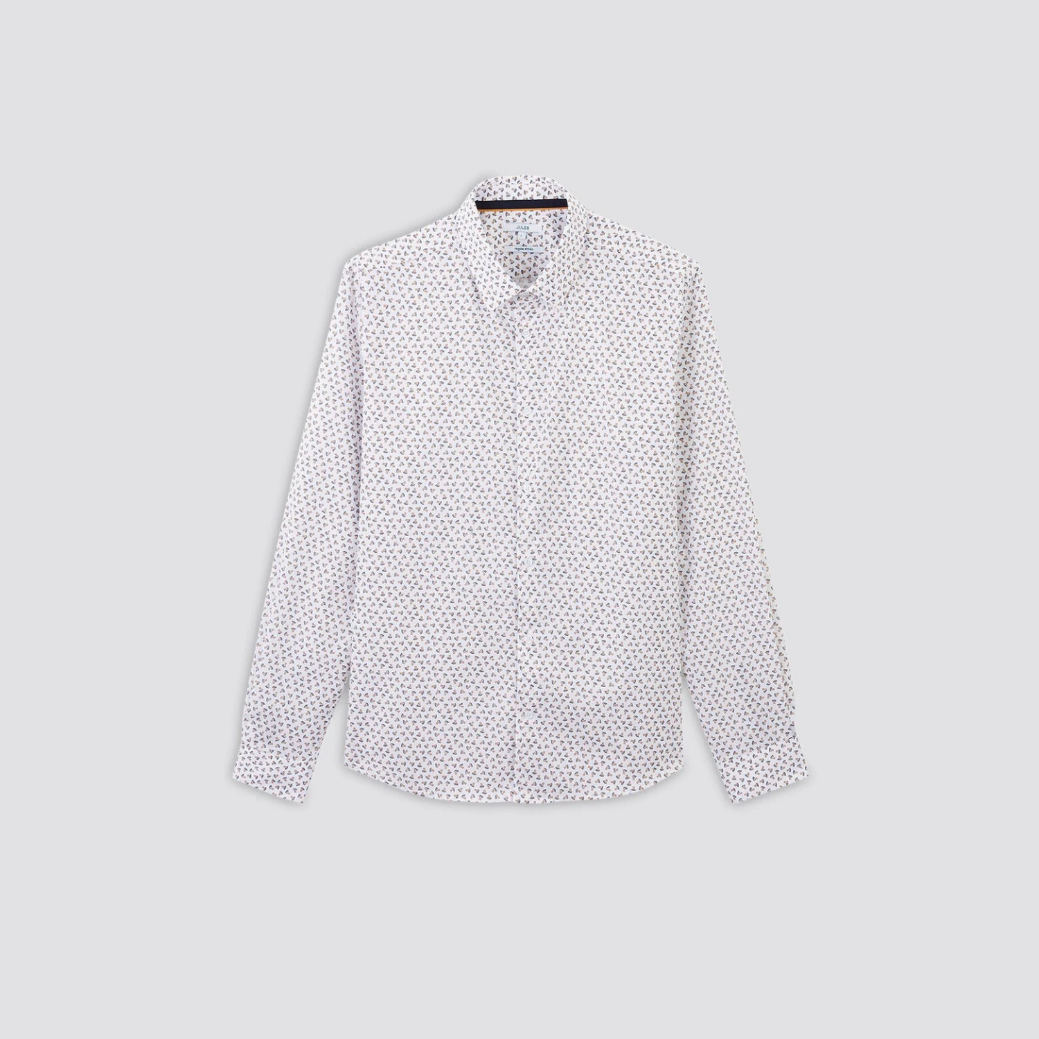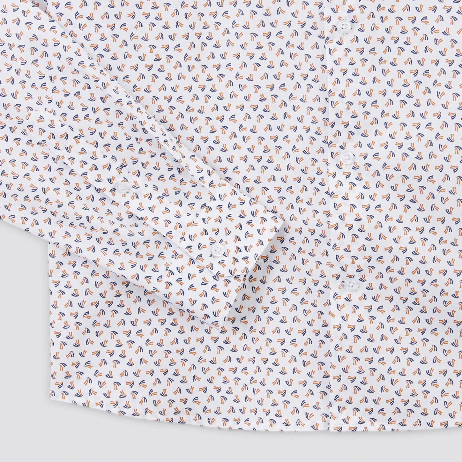 Cette chemise à manches longues en coton, à micro motifs géométriques, possède une fermeture boutonnée, des boutons en bas de manches, une base arrondie et une coupe regular, pour un porté cool.
