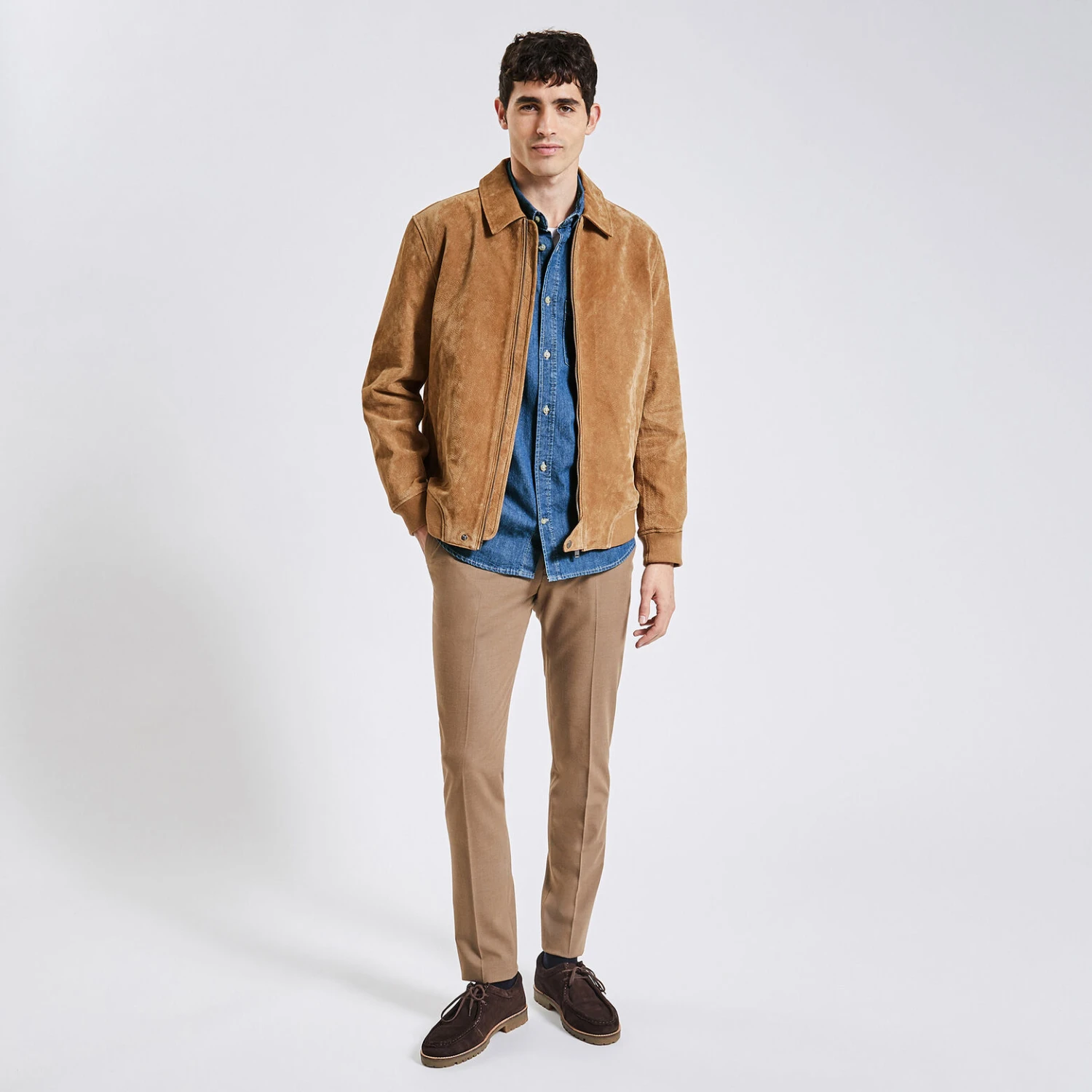 Cette chemise denim, épaisse et épurée, se porte très bien en dessous d’une veste.