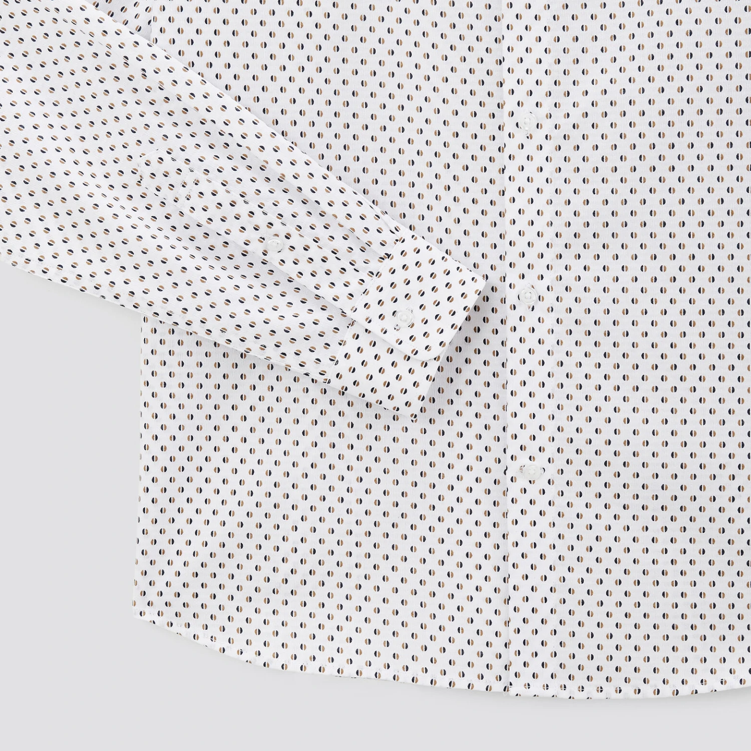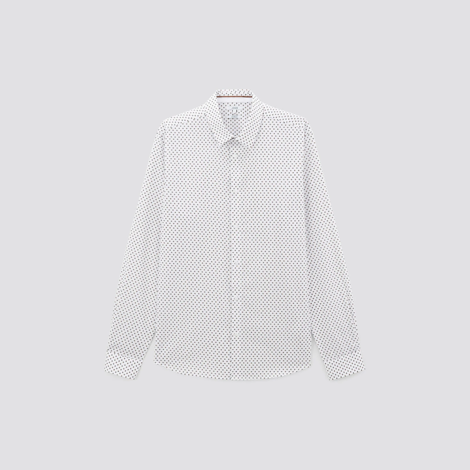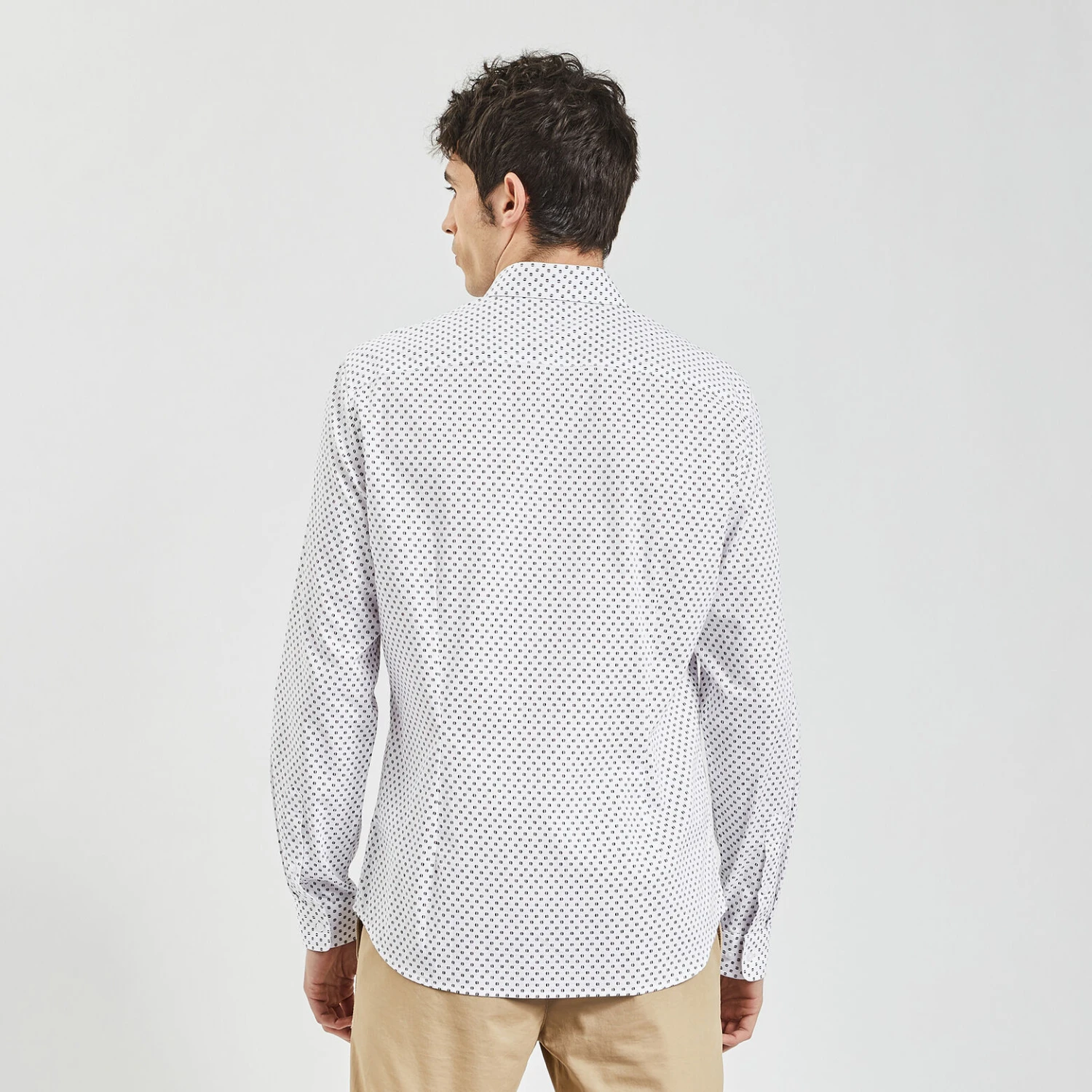 Cette chemise imprimée géométrique est confectionnée en 100% coton dobby qui allie la douceur du coton à la texture alvéolée et soyeuse de son tissage. Fibre naturelle, le coton est léger et respirant, hypoallergénique et adapté aux peaux sensibles. La chemise en dobby se prête aux occasions élégantes.