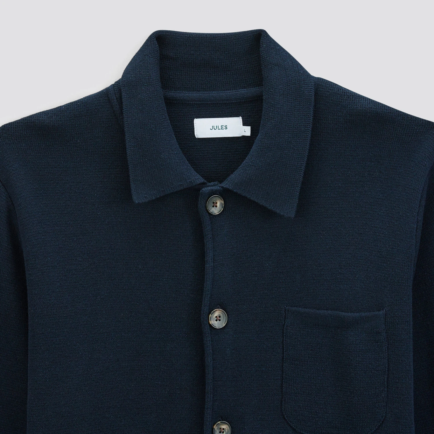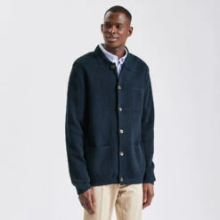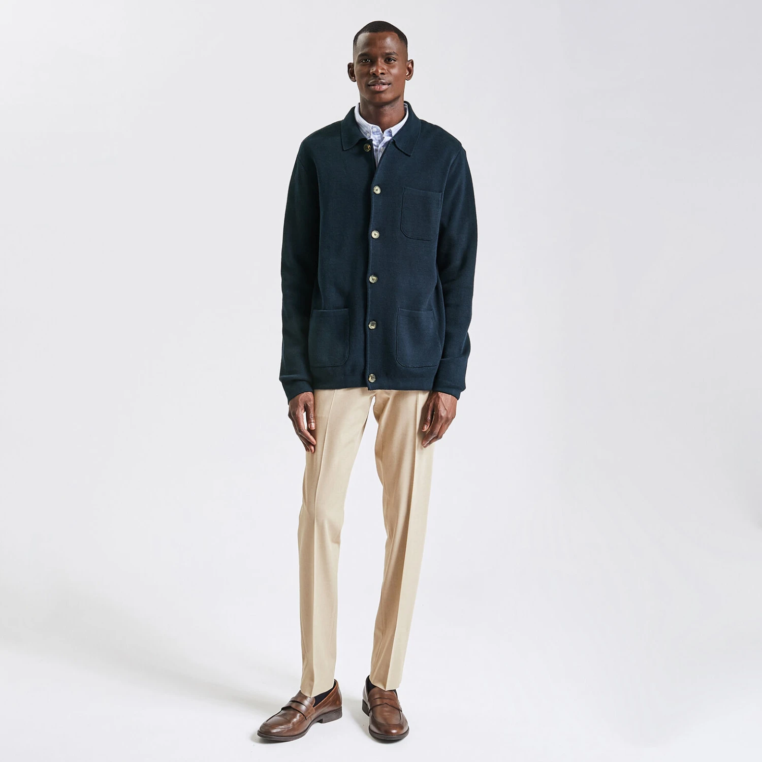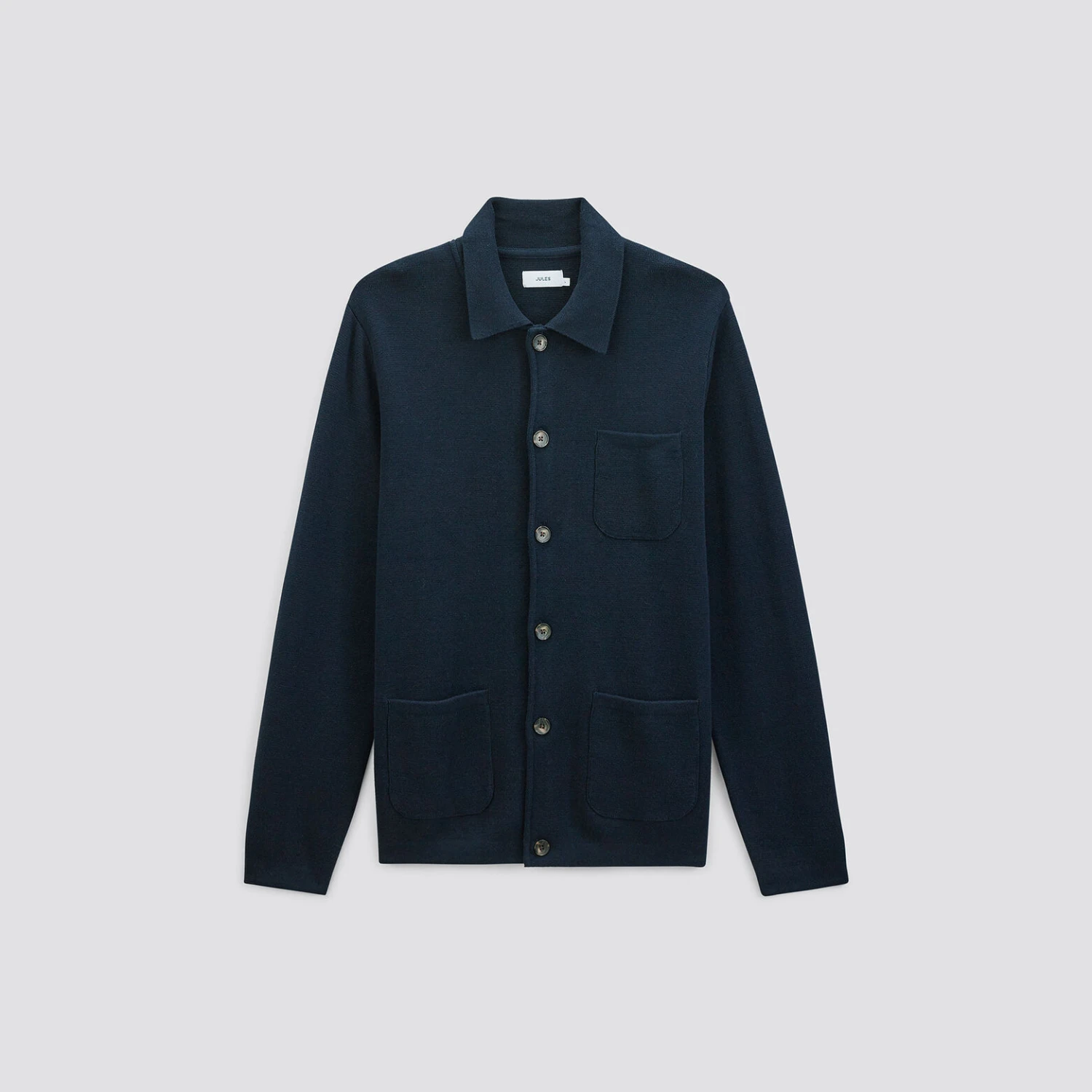 Ce gilet en maille possède une fermeture boutonnée, un col polo, deux poches latérales plaquées, et une poche poitrine plaquée. Il possède des bas de manche et un bas de corps en bord-côtes. Sa coupe est regular, pour un porté décontracté.