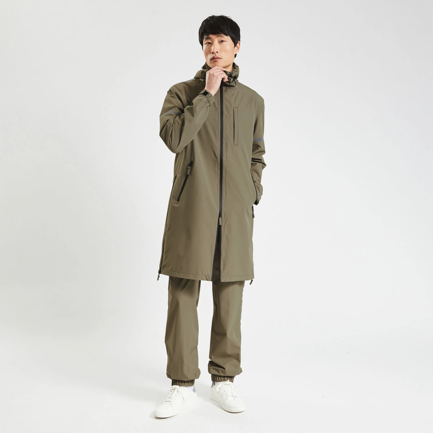 Ce manteau hybride mobilité douce possède une capuche à large visière avec cordon de serrage, pour pouvoir porter son casque de vélo en même temps, une poche passepoilée pressionnée poitrine, 2 poches zippées avant, une fermeture zippée double curseur, des bas de manches resserrables et un bas de corps avec cordon de serrage également. Le manteau est doté d’imprimés réfléchissants à la lumière sur la capuche, le haut du dos et les bras. Tous les zips sont imperméables et les poignets sont ajustables par élastiques et velcro.