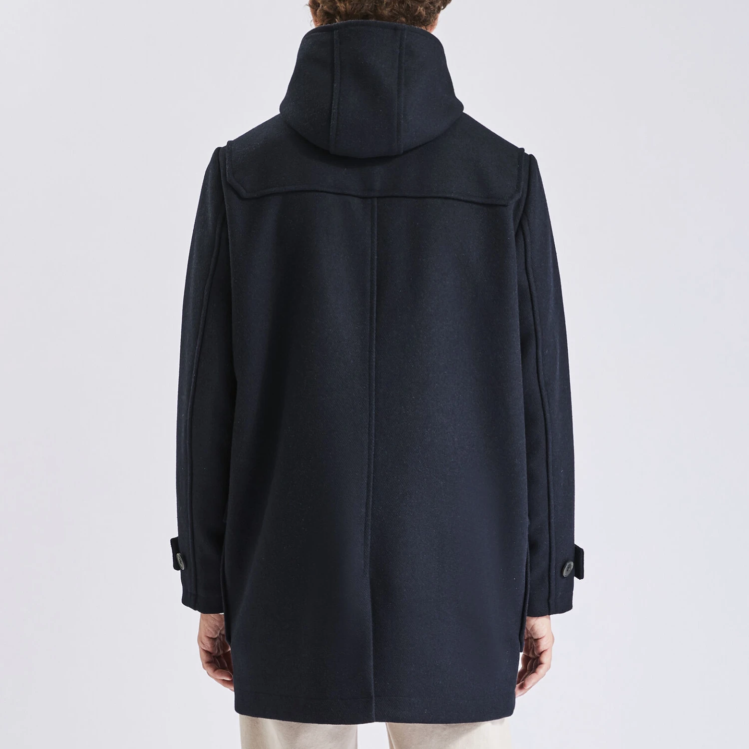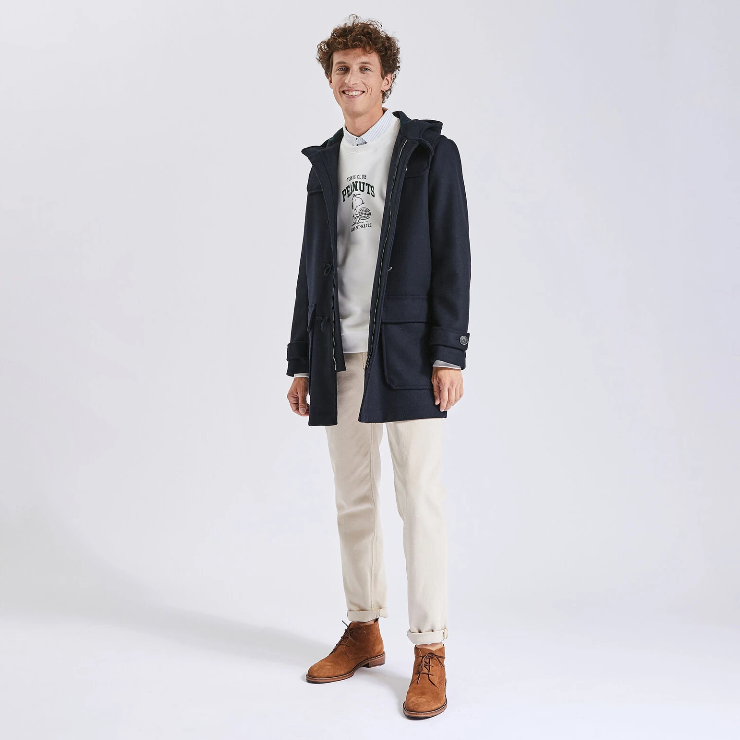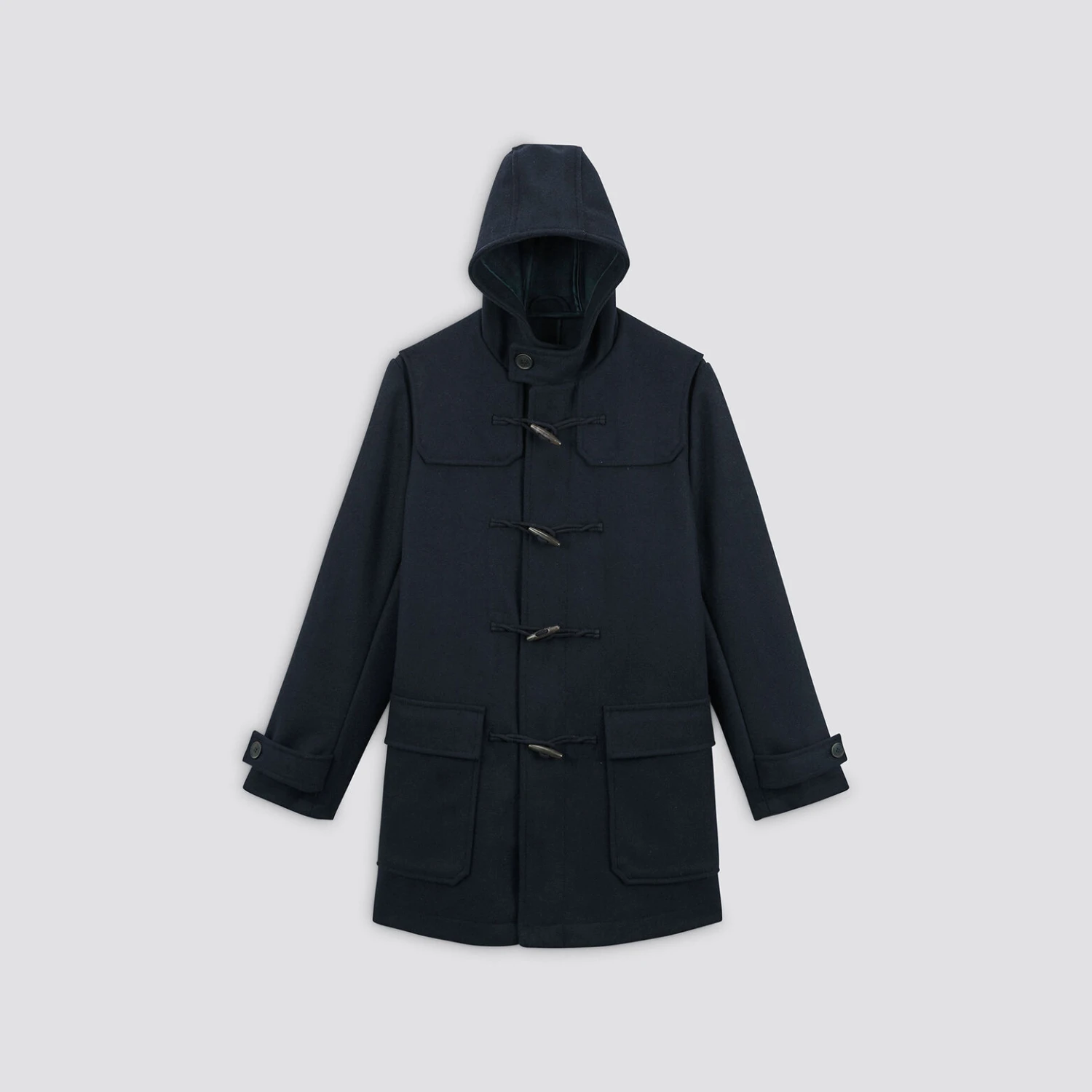 Ce manteau reprend tous les codes du duffle-coat : le tissage épais en laine mélangée, les attaches brandebourg, la capuche et les deux grandes poches plaquées à rabat. Une poche intérieure vient le compléter, ainsi qu’un intérieur à carreaux fantaisie. Le col est boutonné et les bas de manches possèdent des pattes de boutonnage. Sa fermeture est zippée.